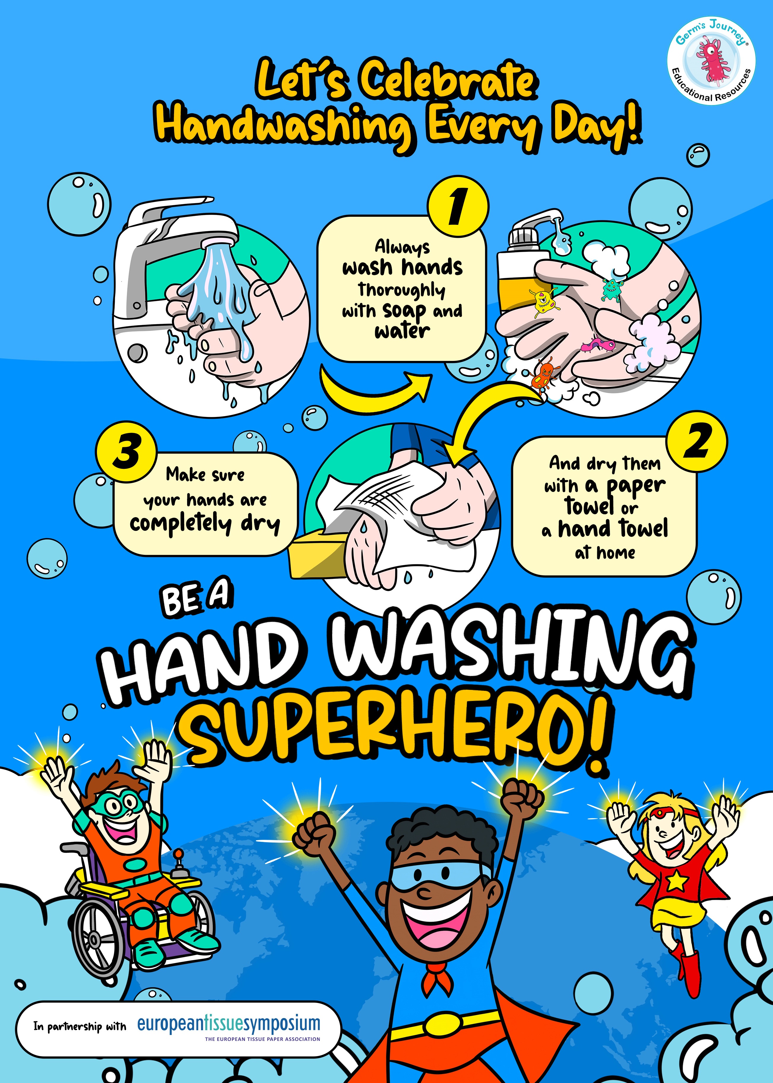 Voici un petit rappel sur la manière de bien se laver les mains, à l'aide d'un mouchoir en papier.
